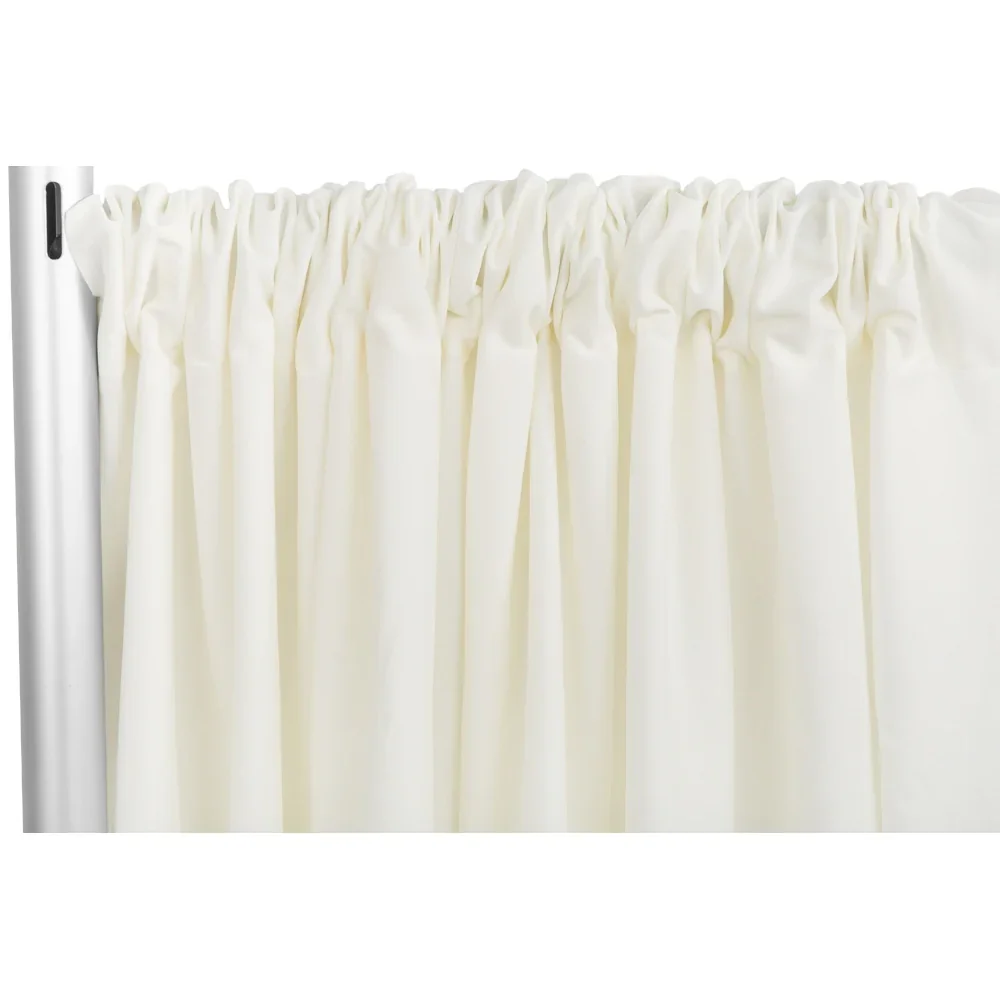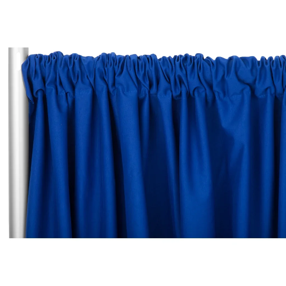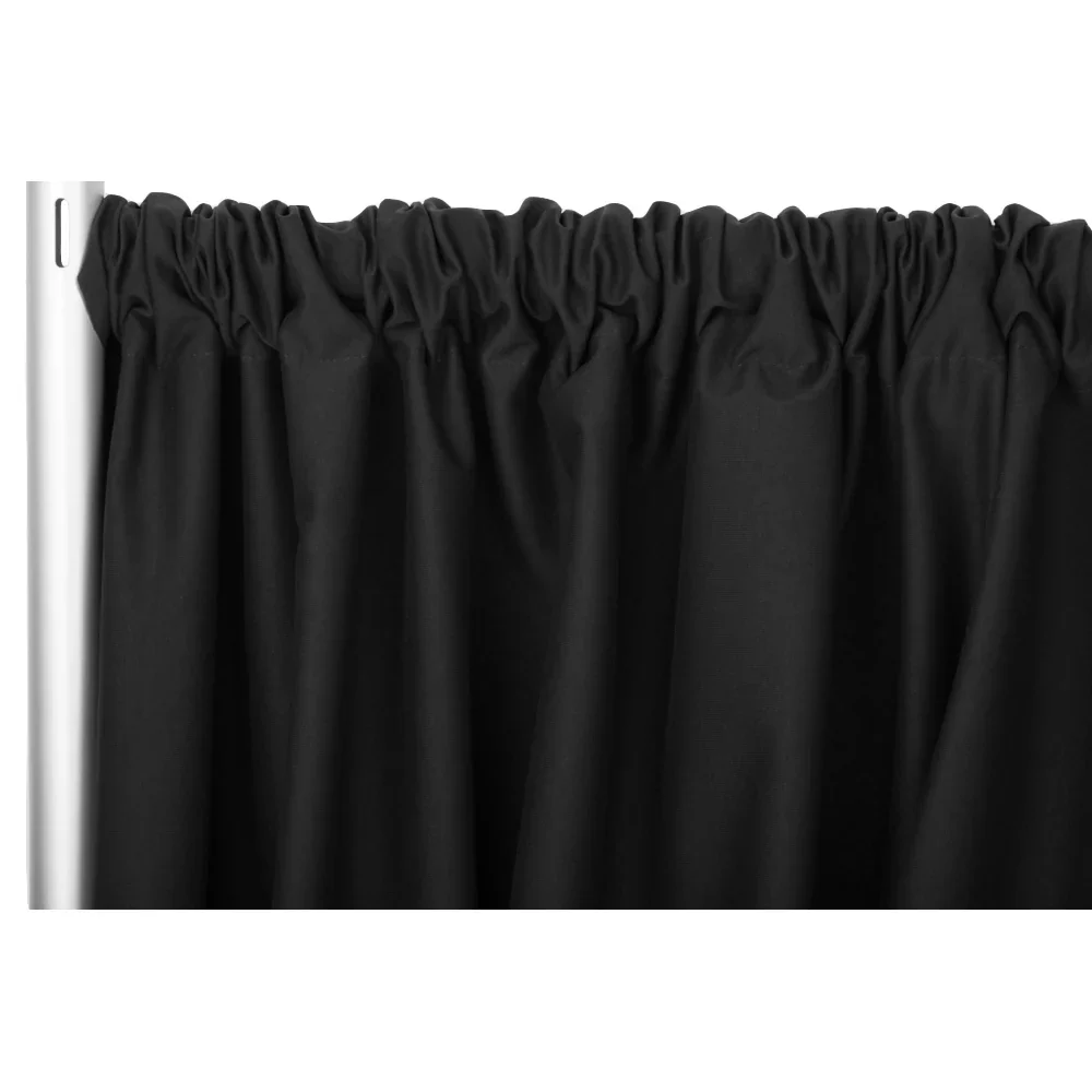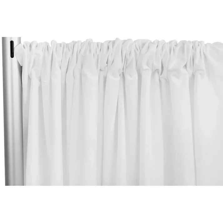 Black, White, Blue, Silver, Teal and Red draping is in stock with other colors available by request. Our Drapes are a Poly Premier fabric (less transparent than banjo cloth) which is a knitted product with a linen look. The perfect choice for a more upscale looking event.